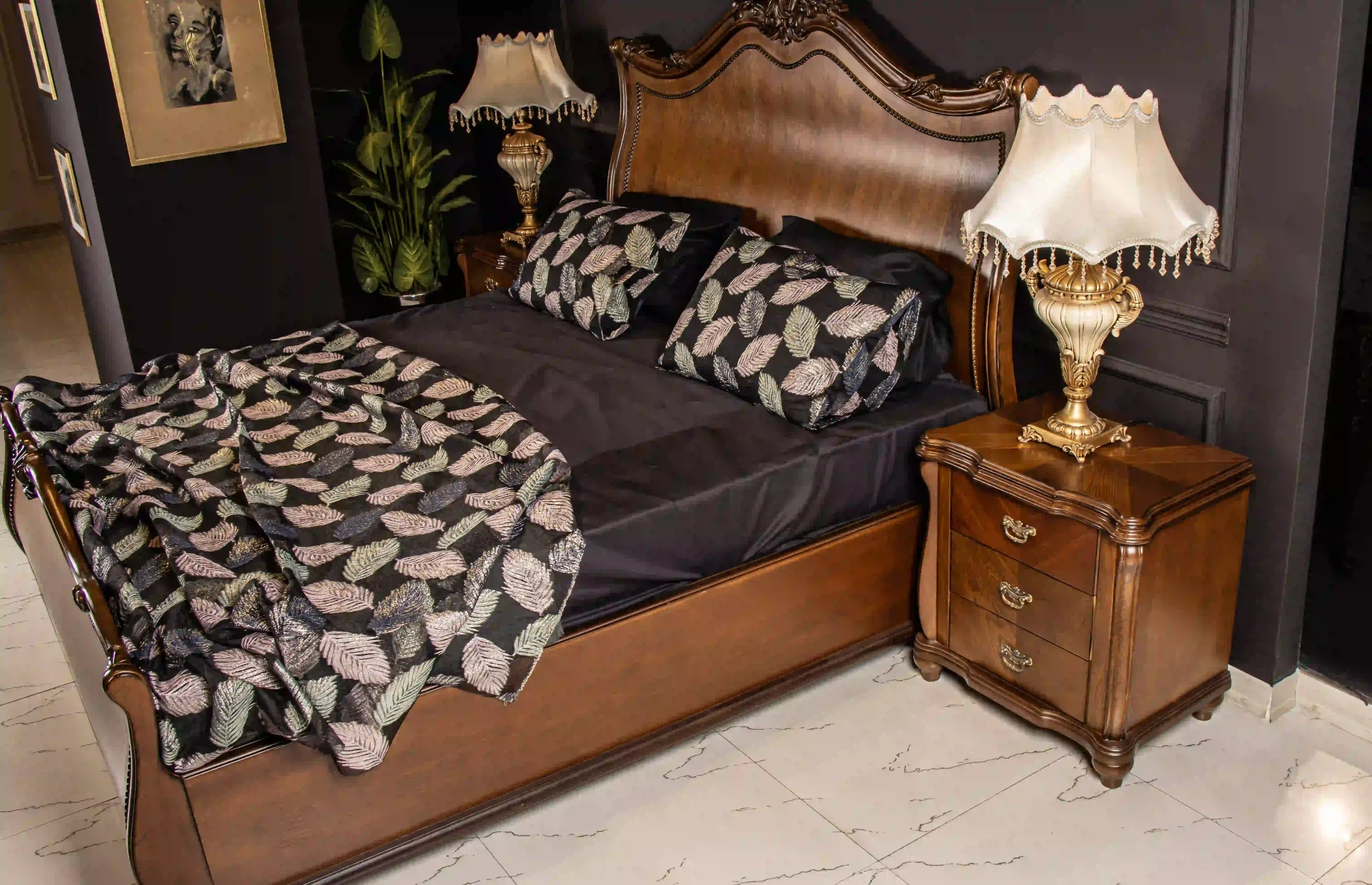 تخت خواب «دیبا» با چوب اصیل راش گرجستان و پرداختی گرم و براق، حضوری باشکوه در فضای اتاق می‌آفریند. حجم‌های کلاسیک، انحناهای روان و منبت‌های نفیس تاج تخت، حال‌وهوایی اشرافی و آرام‌بخش ایجاد کرده‌اند؛ گویی هر خط و هر برگِ کنده‌کاری‌شده روایتگر دقت و صبوری استادکاران است. رنگ قهوه‌ای عمیق چوب، بافتی یکدست و صیقلی دارد و در کنار فرم باشکوه هدبورد، ترکیبی پدید آورده که به‌سادگی مرکز توجه فضای خواب می‌شود.