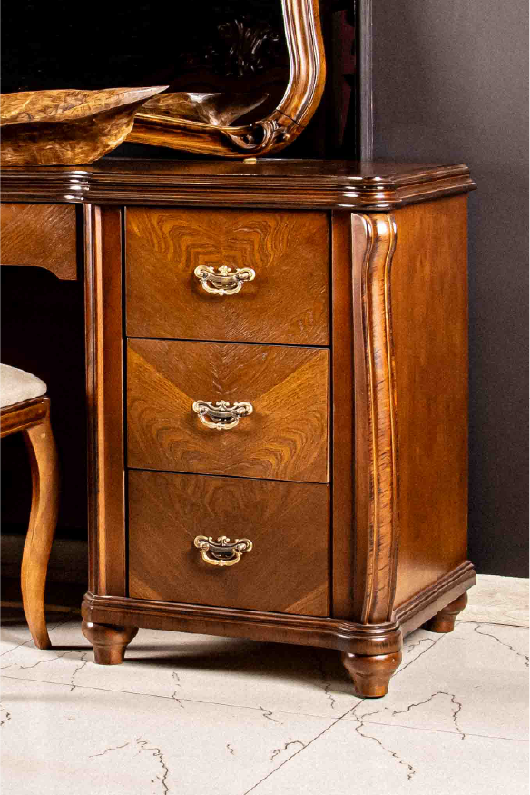 میز آرایش نارسیس با کشوهایی خوش‌چیدمان و دستگیره‌هایی کلاسیک، همراه با آینه‌ای هماهنگ با زبان طراحی مجموعه، نظمی دلنشین به کاربری روزمره می‌بخشد. پاتختی‌ها با تناسب ارتفاع و فرم پایه‌ها، ادامه‌ای طبیعی از شخصیت تخت هستند و با پرداخت دقیق و رنگ گرم چوب، یکپارچگی مجموعه را کامل می‌کنند. امکان انتخاب رنگ دلخواه، آزادی سلیقه را پاس می‌دارد تا این مجموعه با نور، دیوارها و حال‌وهوای شخصی هر فضا هم‌نوا شود.